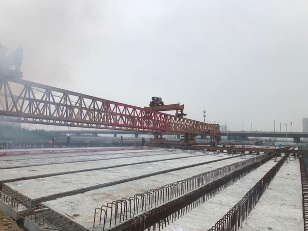 該橋橋梁斷面采用兩幅橋形式,橋梁全寬50.6米,全長(cháng)184.2米。針對橋梁施工范圍內涉及地鐵4號線(xiàn)盾構頂進(jìn)和賈魯河綜合治理等多部門(mén)多作業(yè)施工,我公司邀請了省內知名專(zhuān)家進(jìn)行專(zhuān)項方案評審把關(guān)。在建設過(guò)程中,精心組織,統籌協(xié)調,克服了現場(chǎng)條件復雜、汛期施工難度大等不利因素的影響,抓質(zhì)量,促進(jìn)度,保安全,順利地實(shí)現了橋梁合龍這一關(guān)鍵節點(diǎn)。